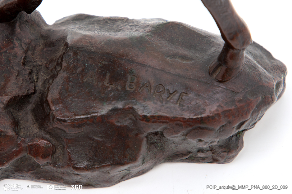 Matéria/Técnica: Desconhecida; Cronologia: Século XIX; Autoria: Barye, Antoine-Louis (1795-1875); Dimensões (cm): Altura: 23,6 cm; Largura: 21,5 cm; Profundidade: 56 cm.