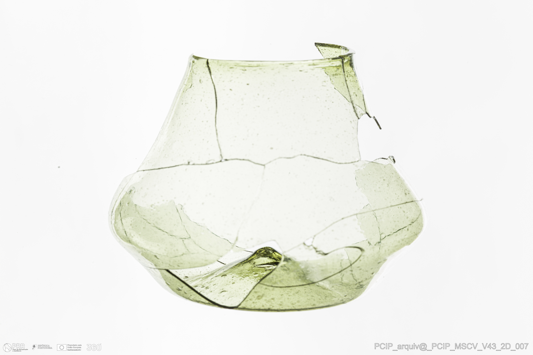 Matéria/Técnica: Vidro; Cronologia: Século XVII; Autoria: Desconhecida; Dimensões: Diâmetro bordo: 50mm; Diâmetro base: 55mm; Altura: 69mm.