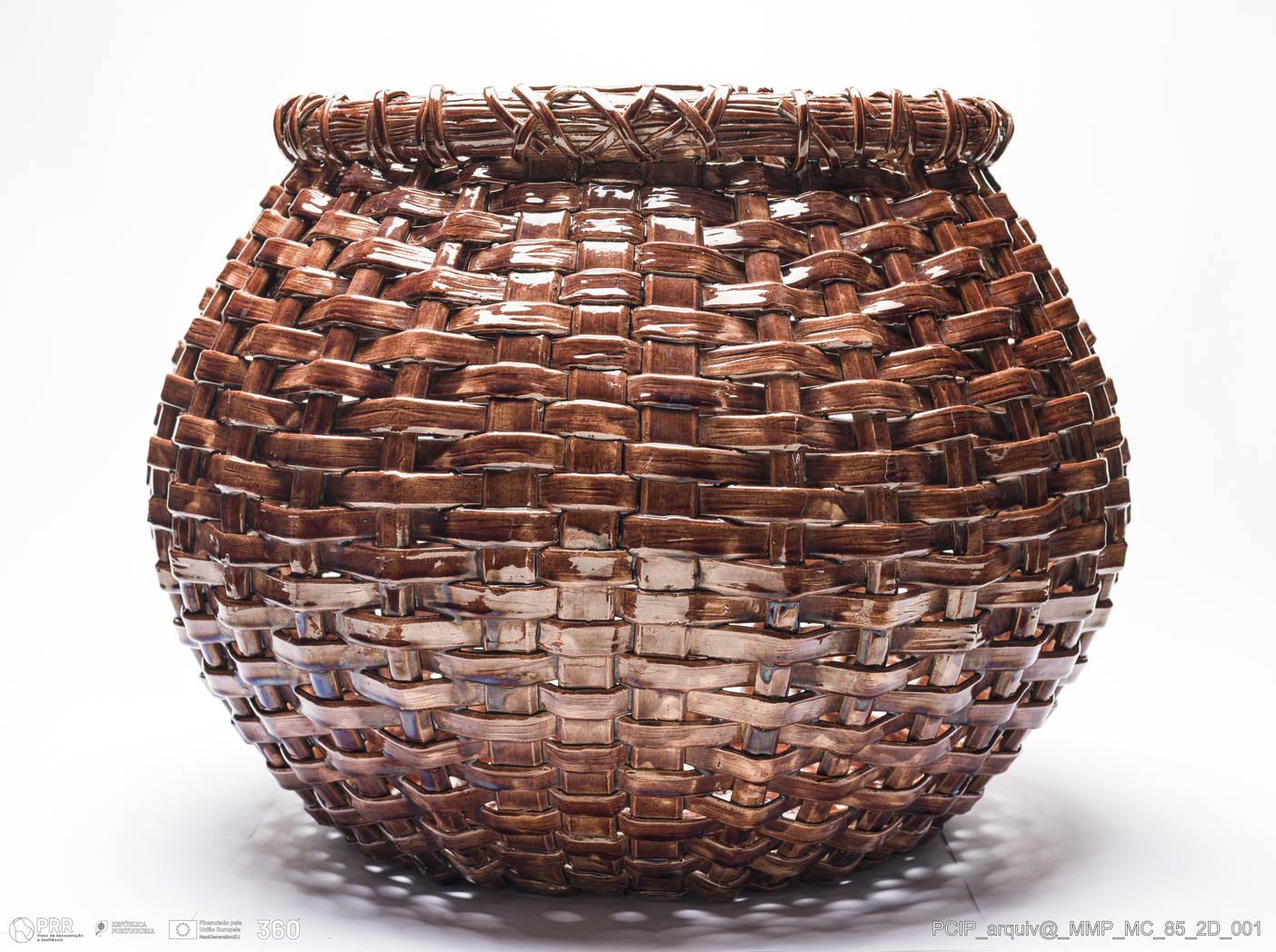 Matéria/Técnica: Barro vermelho modelado. Técnica da verguinha que consiste no entrelaçar, sobre uma forma escolhiada, tiras de pasta obtidas através de uma máquina adaptada para o efeito, dita o engenho. Vidrado castanho; Cronologia: 1903; Autoria: Rafael Bordalo Pinheiro / Fábrica de Faianças das Caldas da Rainha, Portugal; Dimensões (cm): Altura: 35; Diâmetro: 48.