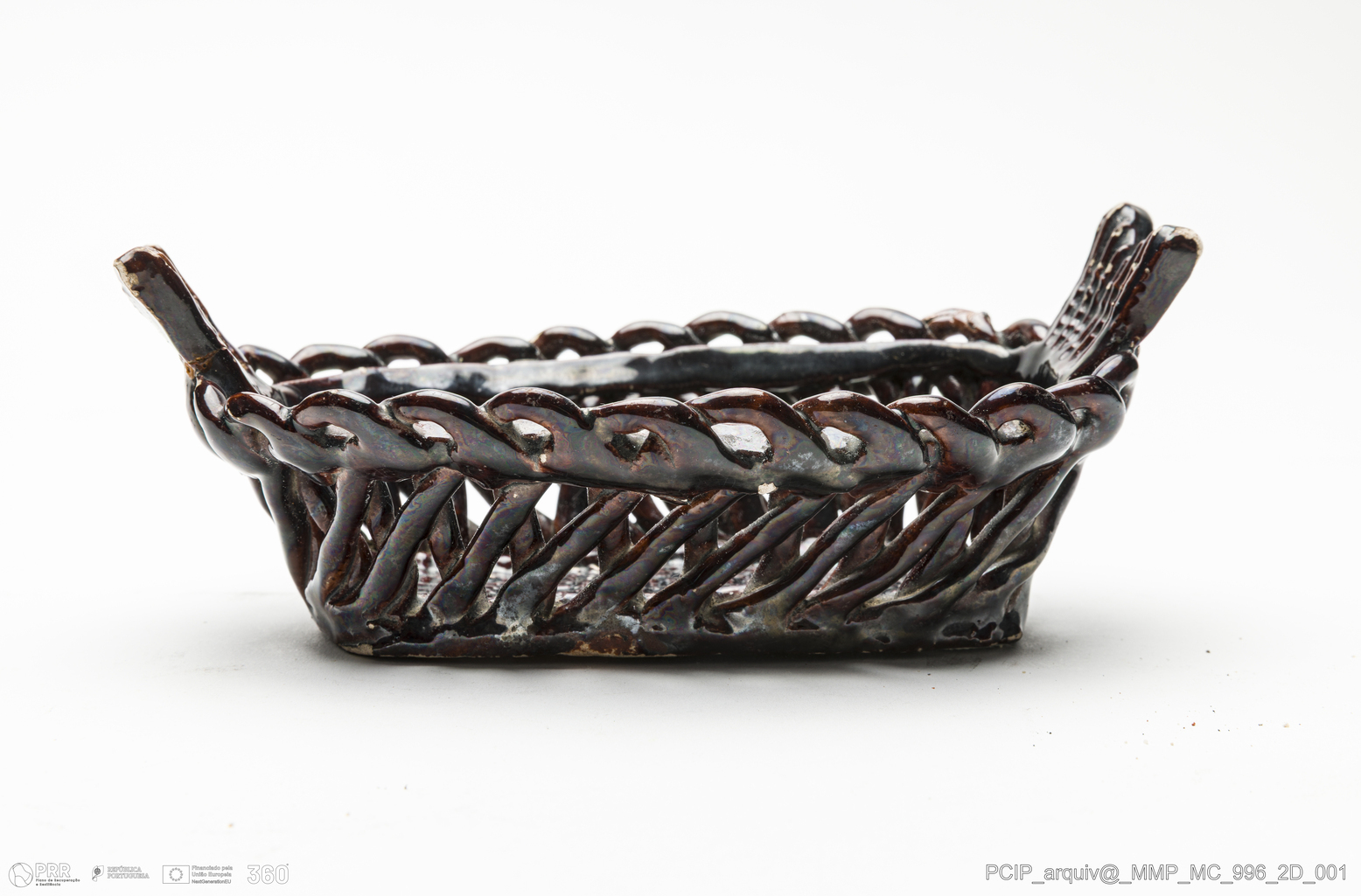 Matéria/Técnica: Barro modelado. Técnica da verguinha, que consiste no entrelaçar, sobre uma forma escolhida, tiras de pasta obtidas através de uma máquina adaptada para o efeito, dita o engenho. Vidrado castanho escuro; Cronologia: século XIX; Autoria: Desconhecido / Caldas da Rainha, Portugal; Dimensões (cm): Altura: 6,8; Largura: 17,1.