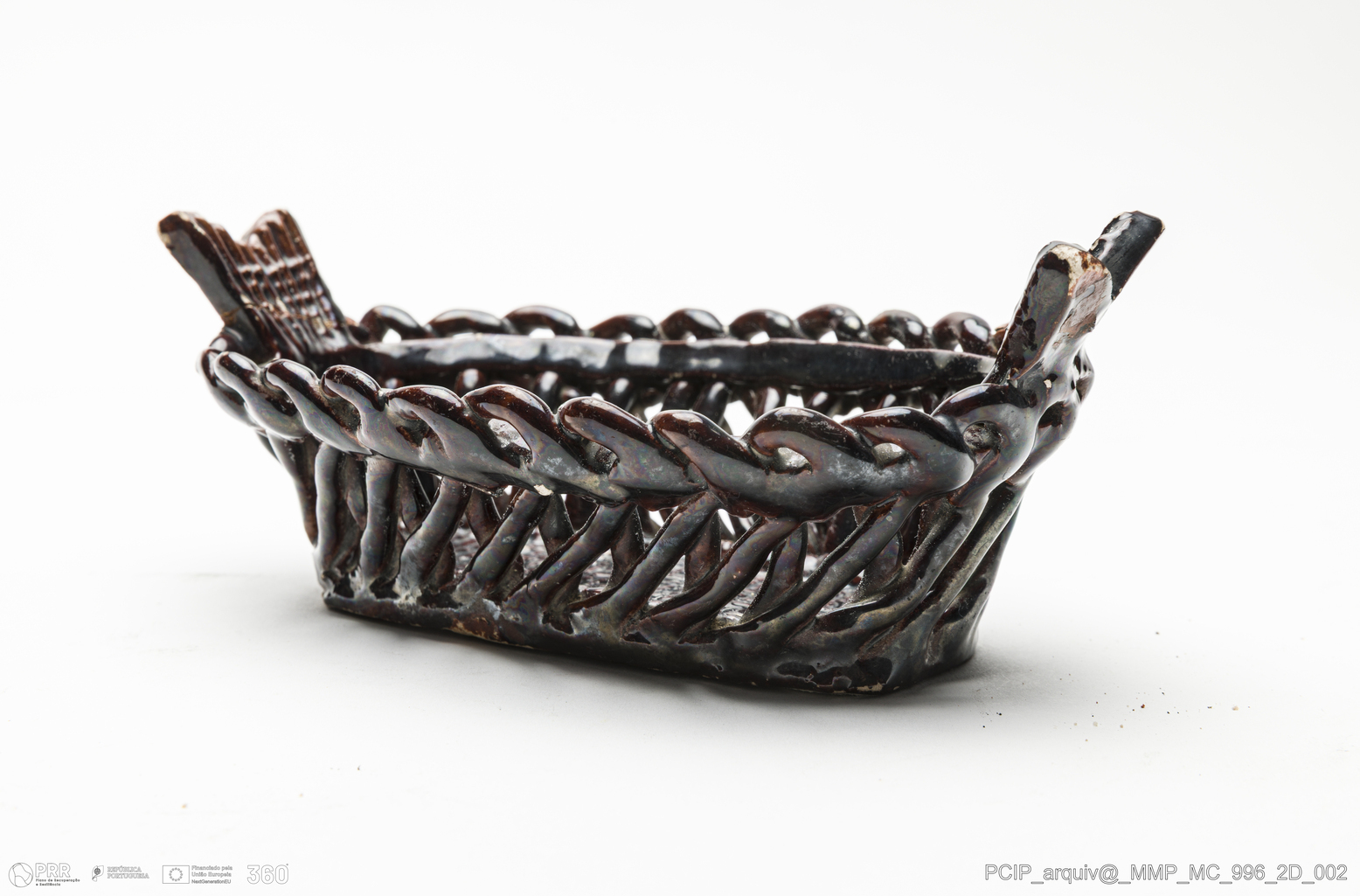 Matéria/Técnica: Barro modelado. Técnica da verguinha, que consiste no entrelaçar, sobre uma forma escolhida, tiras de pasta obtidas através de uma máquina adaptada para o efeito, dita o engenho. Vidrado castanho escuro; Cronologia: século XIX; Autoria: Desconhecido / Caldas da Rainha, Portugal; Dimensões (cm): Altura: 6,8; Largura: 17,1.