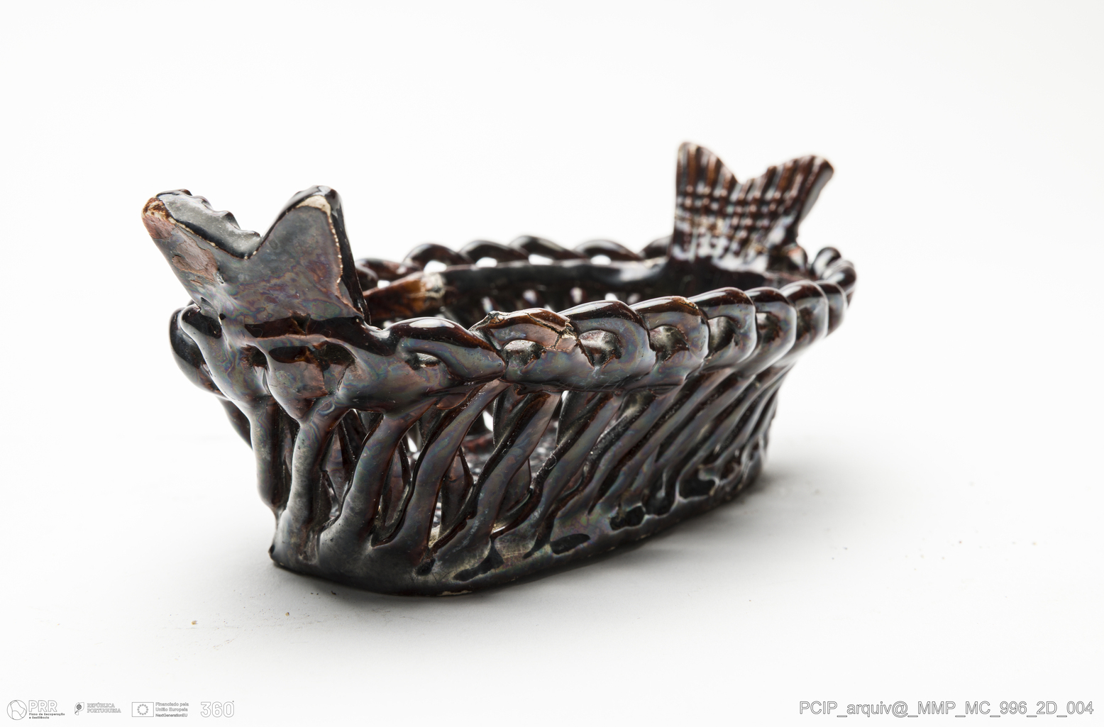 Matéria/Técnica: Barro modelado. Técnica da verguinha, que consiste no entrelaçar, sobre uma forma escolhida, tiras de pasta obtidas através de uma máquina adaptada para o efeito, dita o engenho. Vidrado castanho escuro; Cronologia: século XIX; Autoria: Desconhecido / Caldas da Rainha, Portugal; Dimensões (cm): Altura: 6,8; Largura: 17,1.