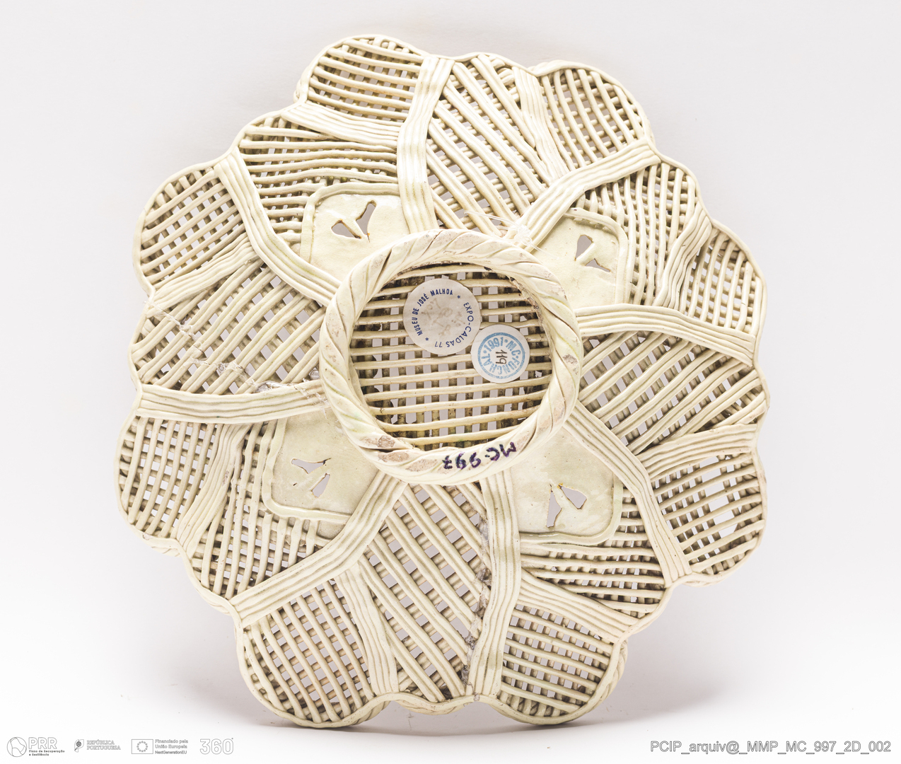Matéria/Técnica: Barro branco. Técnica da verguinha, que consiste no entrelaçar, sobre uma forma escolhiada, tiras de pasta obtidas através de uma máquina adaptada para o efeito, dita o engenho. Vidrado polícromo: transparente, verde de cobre, amarelo de ferro e azul cobalto; Cronologia: século XIX; Autoria: Desconhecido / Caldas da Rainha, Portugal; Dimensões (cm): Altura: 7,2; Largura: 25,1 Profundidade: 24,3.