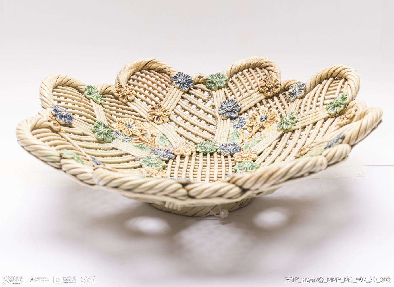 Matéria/Técnica: Barro branco. Técnica da verguinha, que consiste no entrelaçar, sobre uma forma escolhiada, tiras de pasta obtidas através de uma máquina adaptada para o efeito, dita o engenho. Vidrado polícromo: transparente, verde de cobre, amarelo de ferro e azul cobalto; Cronologia: século XIX; Autoria: Desconhecido / Caldas da Rainha, Portugal; Dimensões (cm): Altura: 7,2; Largura: 25,1 Profundidade: 24,3.