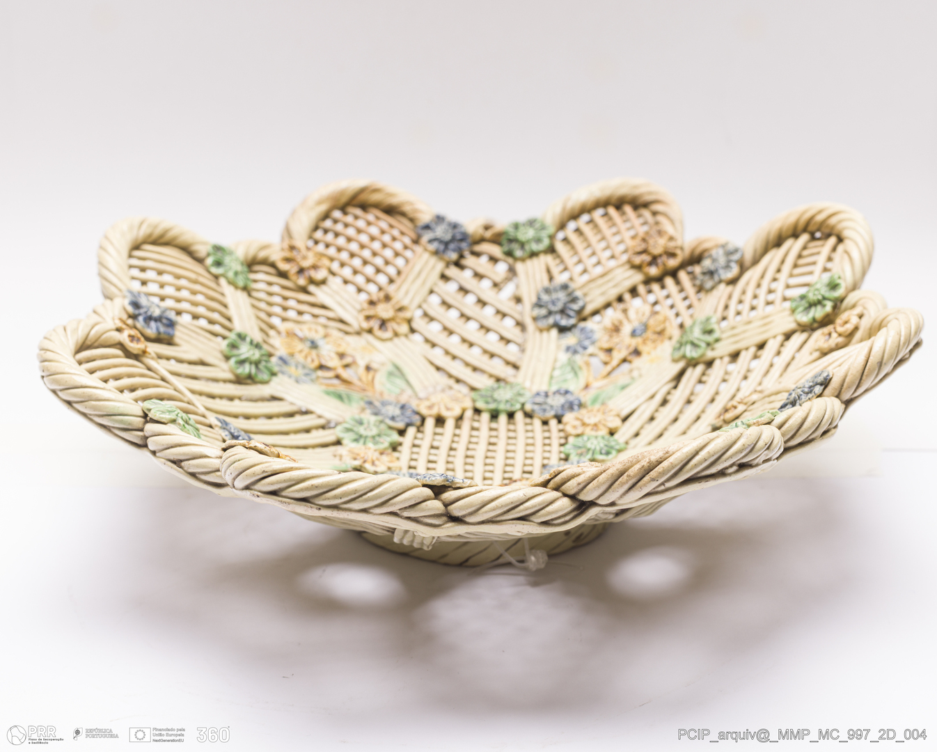 Matéria/Técnica: Barro branco. Técnica da verguinha, que consiste no entrelaçar, sobre uma forma escolhiada, tiras de pasta obtidas através de uma máquina adaptada para o efeito, dita o engenho. Vidrado polícromo: transparente, verde de cobre, amarelo de ferro e azul cobalto; Cronologia: século XIX; Autoria: Desconhecido / Caldas da Rainha, Portugal; Dimensões (cm): Altura: 7,2; Largura: 25,1 Profundidade: 24,3.