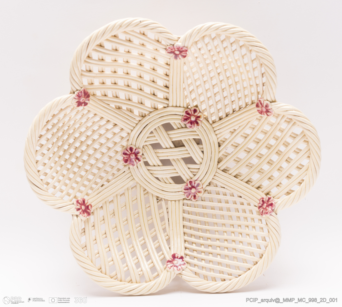 Matéria/Técnica: Barro branco. Técnica da verguinha, que consiste no entrelaçar, sobre uma forma escolhiada, tiras de pasta obtidas através de uma máquina adaptada para o efeito, dita o engenho. Vidrado polícromo: transparente e rosa; Cronologia: século XIX-XX; Autoria: Desconhecido / Caldas da Rainha, Portugal; Dimensões (cm): Altura: 6,5; Largura: 22,4.