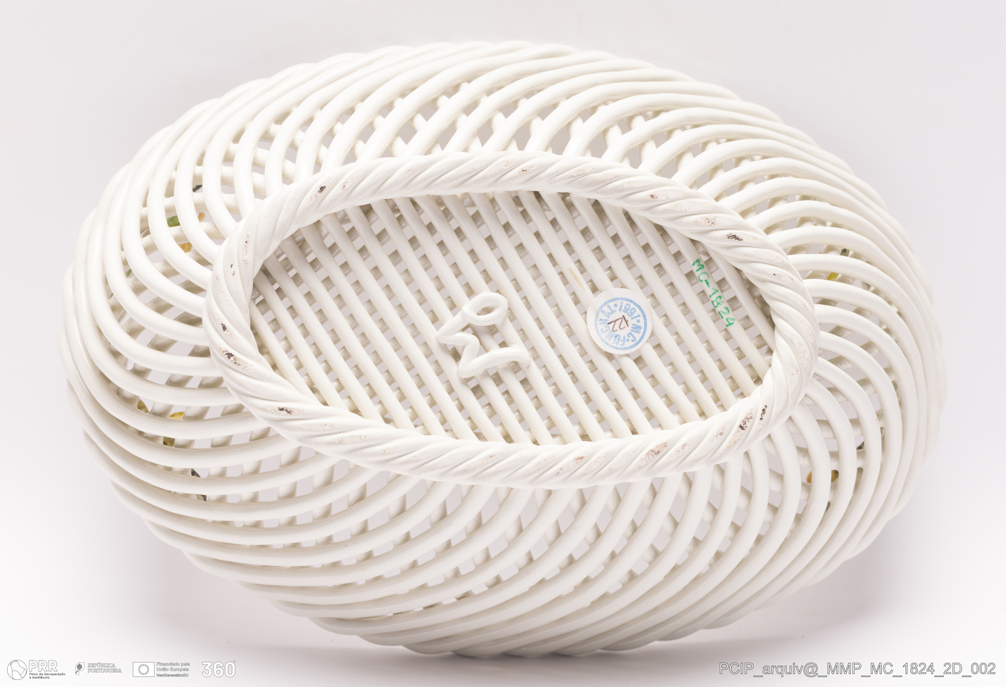 Matéria/Técnica: Barro branco modelado. Tecnica da verguinha que consiste no entrelaçar, sobre uma forma escolhiada, tiras de pasta obtidas através de uma máquina adaptada para o efeito, dita o engenho. Vidrado polícromo: transparente, amarelo, rosa e verde; Cronologia: 1986; Autoria: Maria Julia Arroja / Fábrica de Faianças Subtil, Caldas da Rainha, Portugal; Dimensões (cm): Altura: 10; Largura: 18; Comprimento: 28.