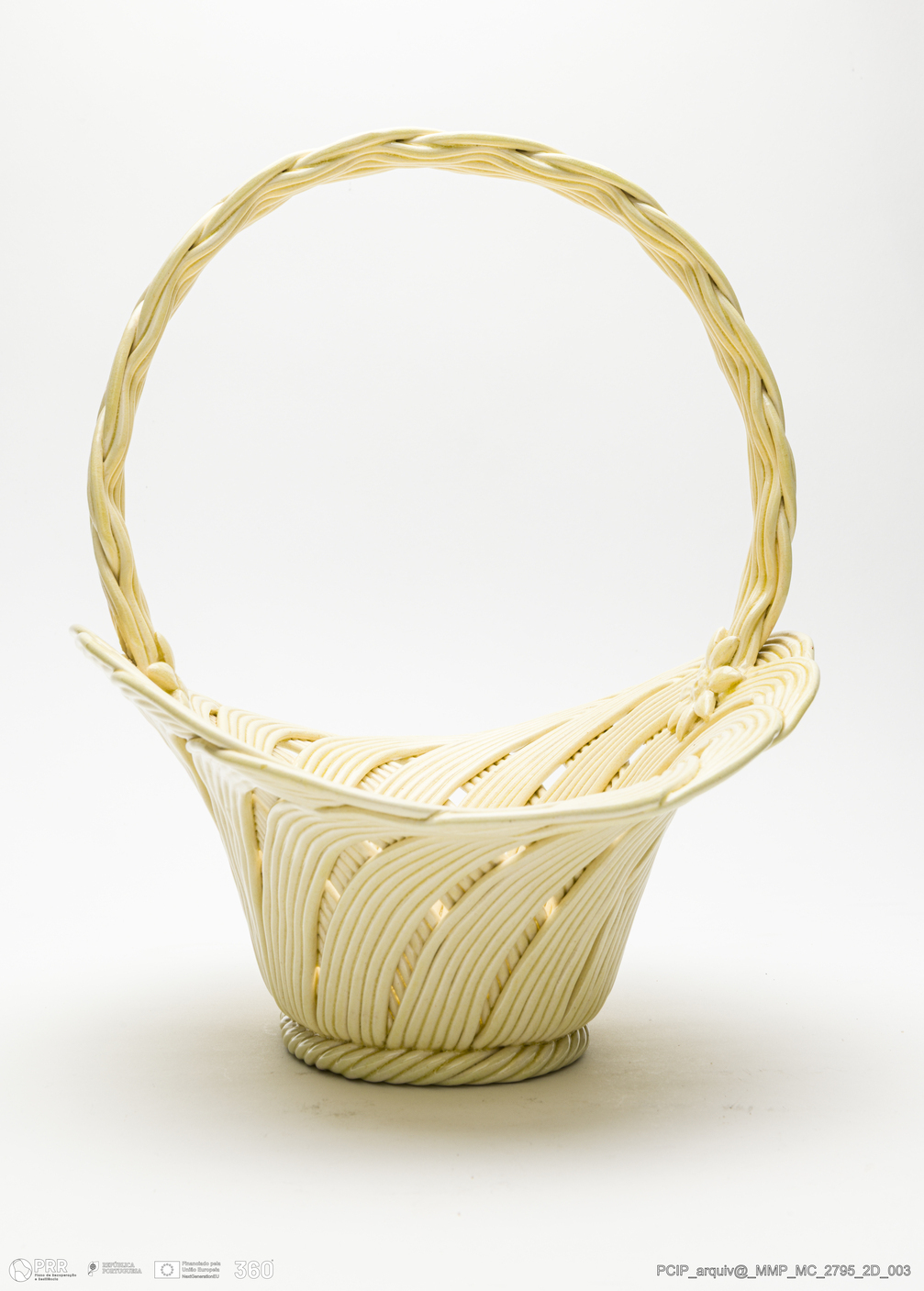 Matéria/Técnica: Pasta de faiança branca modelada. A técnica da verguinha consiste no entrelaçar, sobre uma forma escolhida, tiras de pasta obtidas através de uma máquina adaptada para o efeito, dita o engenho. Vidrado transparente; Cronologia: século XX; Autoria: José Avelino Soares Belo / Fábrica de José Belo, Caldas da Rainha, Portugal; Dimensões (cm): Altura: 28.