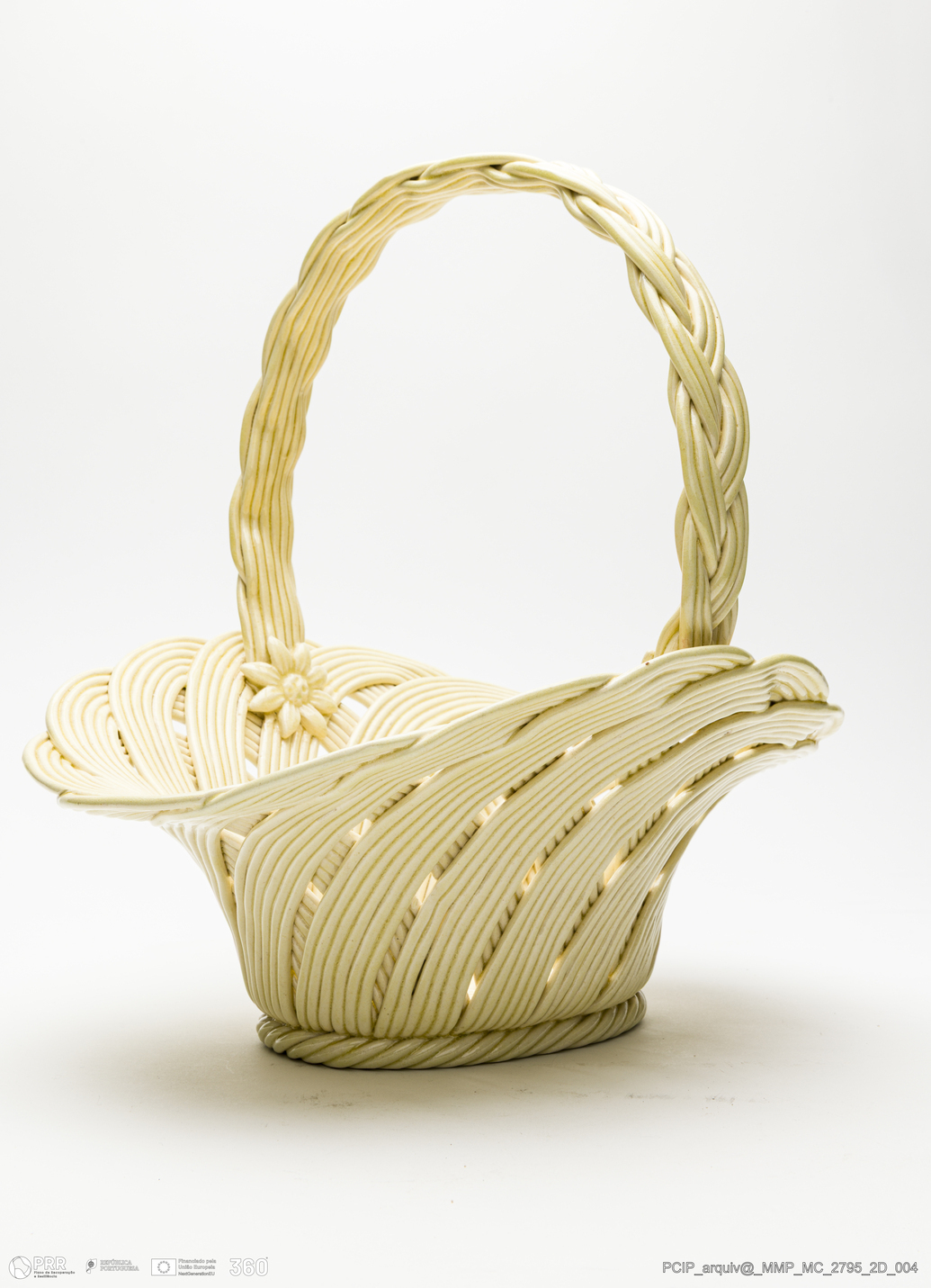 Matéria/Técnica: Pasta de faiança branca modelada. A técnica da verguinha consiste no entrelaçar, sobre uma forma escolhida, tiras de pasta obtidas através de uma máquina adaptada para o efeito, dita o engenho. Vidrado transparente; Cronologia: século XX; Autoria: José Avelino Soares Belo / Fábrica de José Belo, Caldas da Rainha, Portugal; Dimensões (cm): Altura: 28.