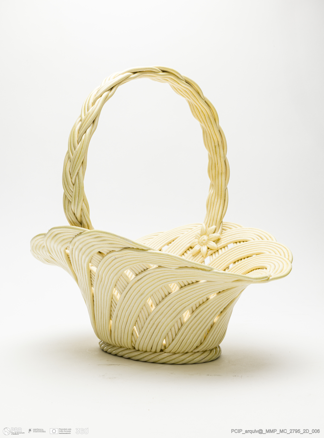 Matéria/Técnica: Pasta de faiança branca modelada. A técnica da verguinha consiste no entrelaçar, sobre uma forma escolhida, tiras de pasta obtidas através de uma máquina adaptada para o efeito, dita o engenho. Vidrado transparente; Cronologia: século XX; Autoria: José Avelino Soares Belo / Fábrica de José Belo, Caldas da Rainha, Portugal; Dimensões (cm): Altura: 28.