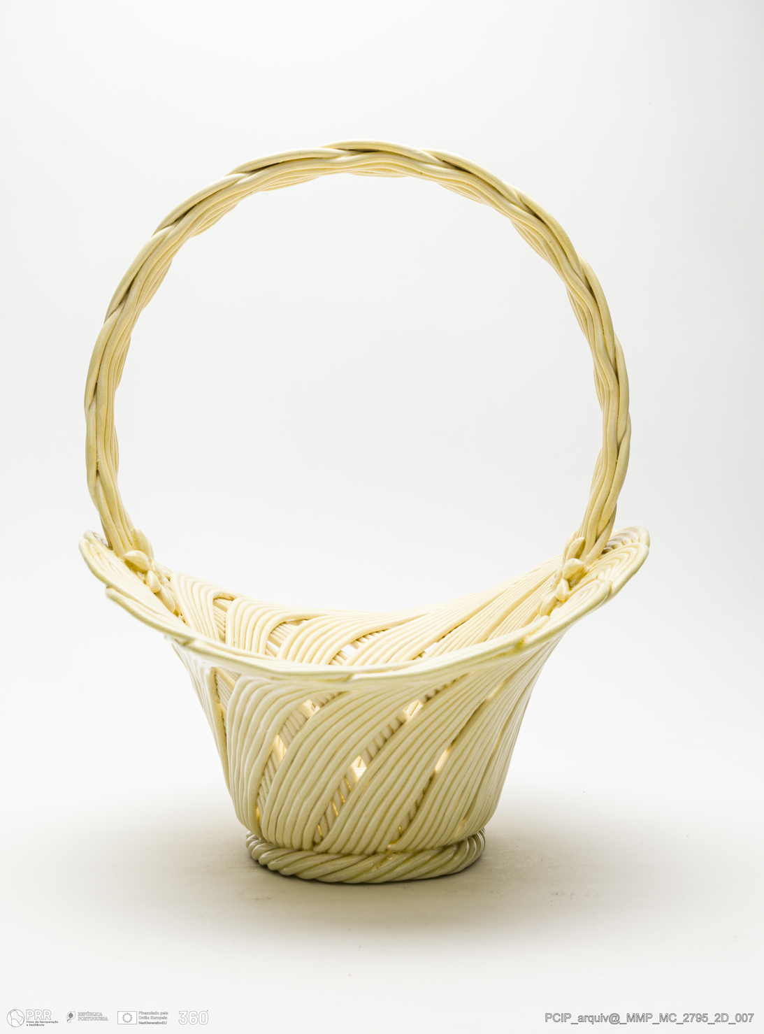 Matéria/Técnica: Pasta de faiança branca modelada. A técnica da verguinha consiste no entrelaçar, sobre uma forma escolhida, tiras de pasta obtidas através de uma máquina adaptada para o efeito, dita o engenho. Vidrado transparente; Cronologia: século XX; Autoria: José Avelino Soares Belo / Fábrica de José Belo, Caldas da Rainha, Portugal; Dimensões (cm): Altura: 28.