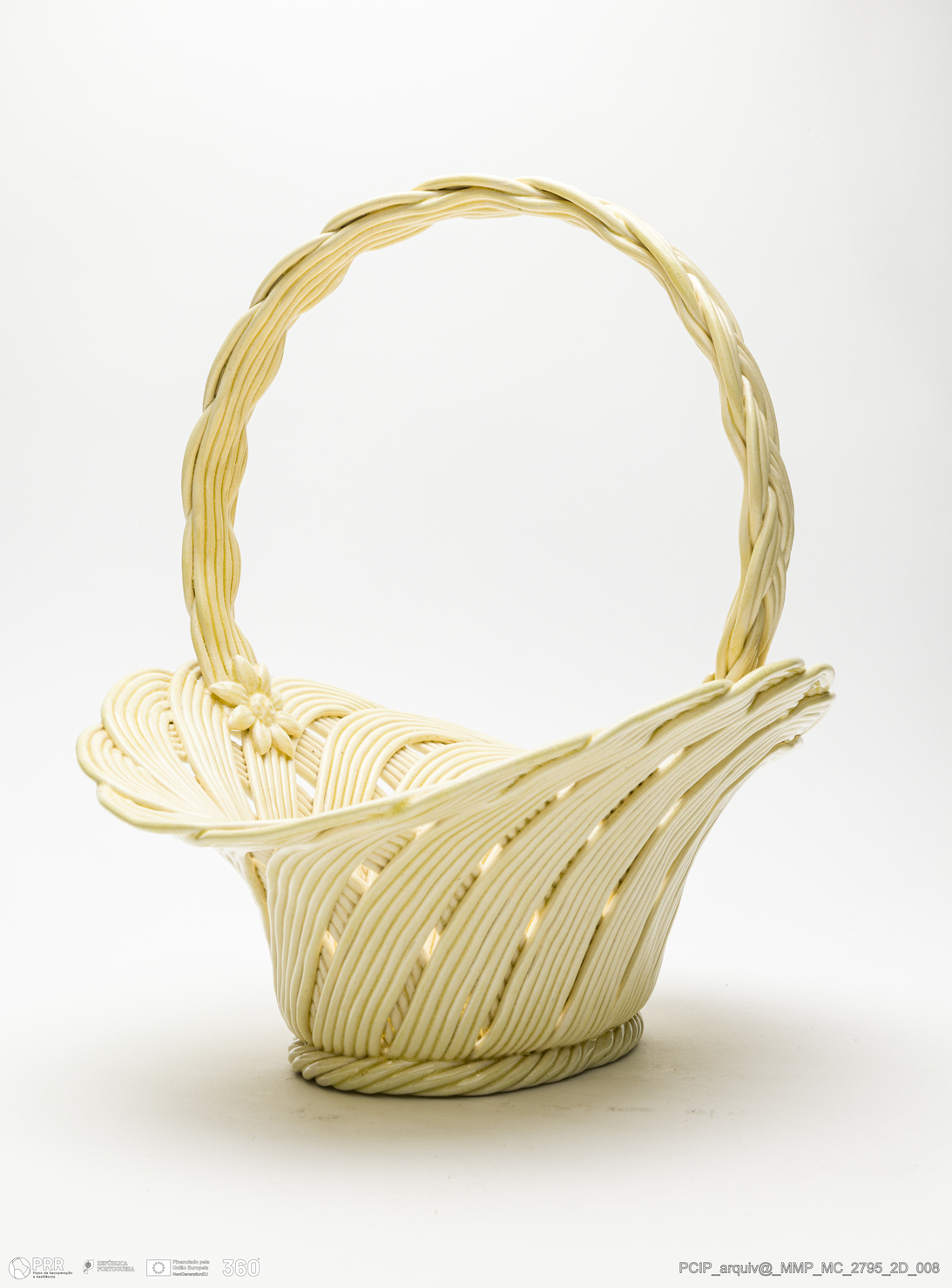 Matéria/Técnica: Pasta de faiança branca modelada. A técnica da verguinha consiste no entrelaçar, sobre uma forma escolhida, tiras de pasta obtidas através de uma máquina adaptada para o efeito, dita o engenho. Vidrado transparente; Cronologia: século XX; Autoria: José Avelino Soares Belo / Fábrica de José Belo, Caldas da Rainha, Portugal; Dimensões (cm): Altura: 28.
