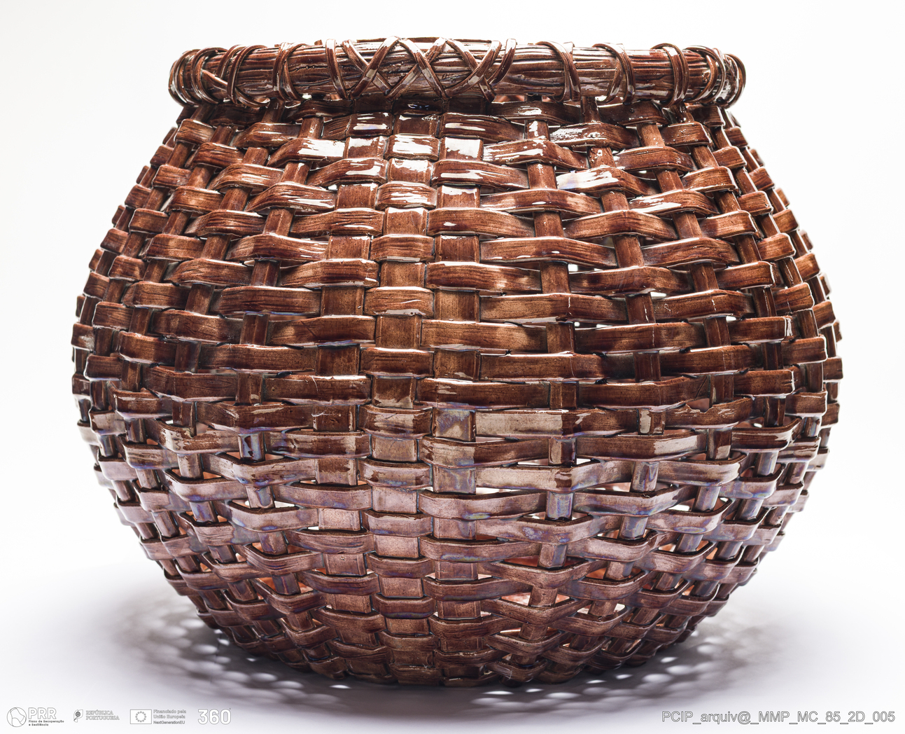 Matéria/Técnica: Barro vermelho modelado. Técnica da verguinha que consiste no entrelaçar, sobre uma forma escolhiada, tiras de pasta obtidas através de uma máquina adaptada para o efeito, dita o engenho. Vidrado castanho; Cronologia: 1903; Autoria: Rafael Bordalo Pinheiro / Fábrica de Faianças das Caldas da Rainha, Portugal; Dimensões (cm): Altura: 35; Diâmetro: 48.