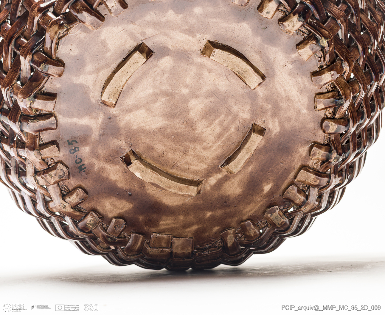 Matéria/Técnica: Barro vermelho modelado. Técnica da verguinha que consiste no entrelaçar, sobre uma forma escolhiada, tiras de pasta obtidas através de uma máquina adaptada para o efeito, dita o engenho. Vidrado castanho; Cronologia: 1903; Autoria: Rafael Bordalo Pinheiro / Fábrica de Faianças das Caldas da Rainha, Portugal; Dimensões (cm): Altura: 35; Diâmetro: 48.