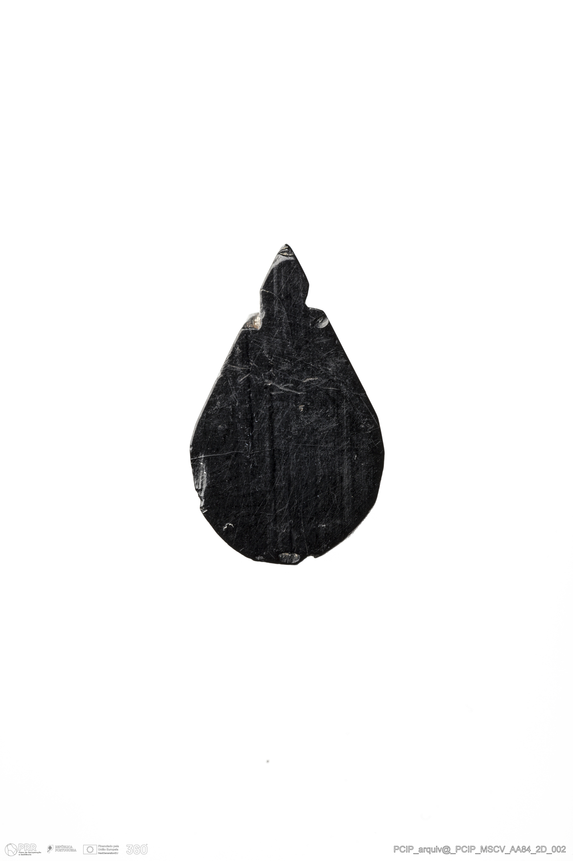 Matéria/Técnica: Azeviche; Cronologia: Século XVI-XVII; Autoria: Desconhecida; Dimensões: Largura: 10mm Altura / Espessura: 4mm Comprimento / Profundidade: 17mm.
