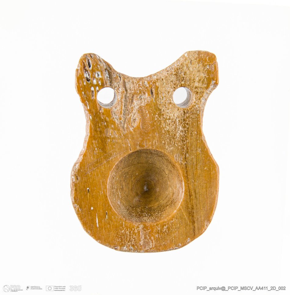 Matéria/Técnica: Osso; Cronologia: Século XVI-XVII; Autoria: Desconhecida; Dimensões: Largura: 23mm; Altura: 33mm; Espessura: 8mm.