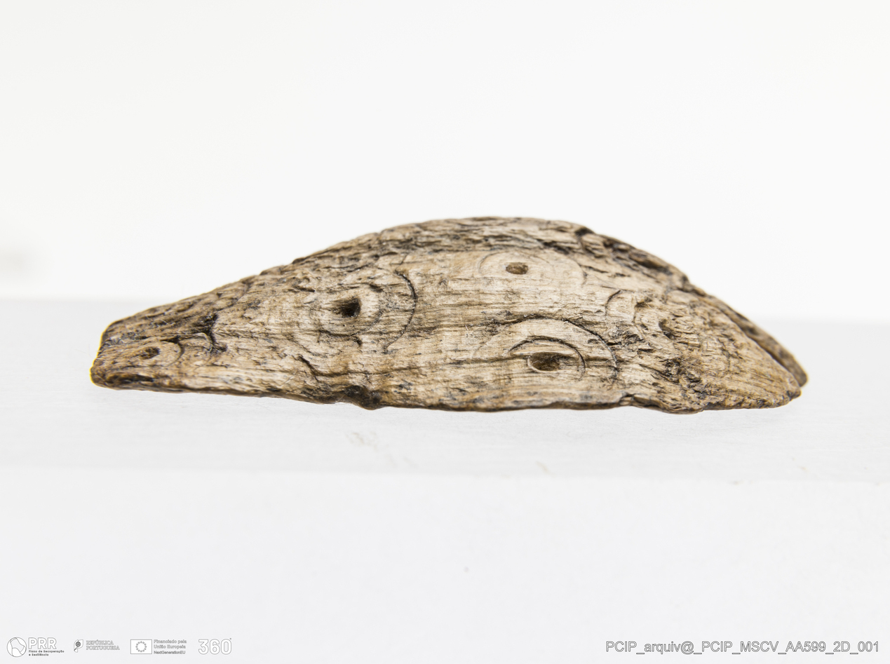 Matéria/Técnica: Madeira; Cronologia: Século XVI-XVII; Autoria: Desconhecida; Dimensões: Largura: 29mm; Altura: 53mm; Espessura: 11mm.