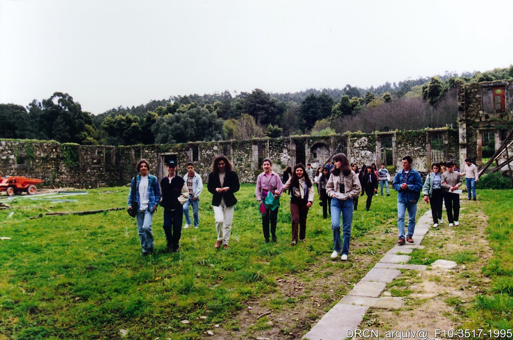 Registo de um grupo de alunos em visita pelo mosteiro a passar pelo Claustro do Refeitório.